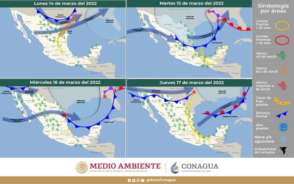 El miércoles, un nuevo frente frío se aproximará a Baja California, extendiéndose el jueves sobre el noroeste y norte de la República Mexicana, interaccionará con la corriente en chorro, favoreciendo rachas fuertes de viento en dichas regiones.