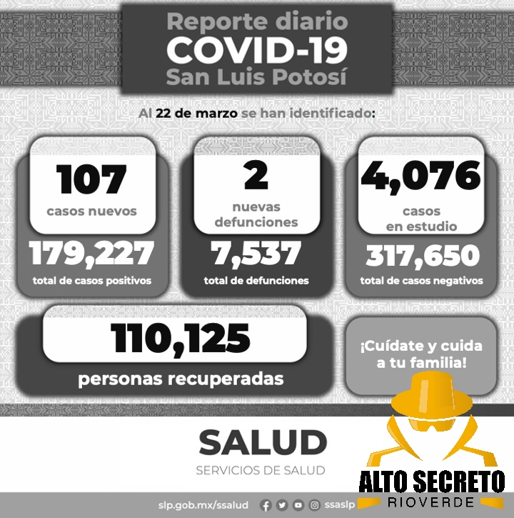 Para este martes 22 de marzo el Comité Estatal para la Seguridad en Salud y los Servicios de Salud, informan 107 nuevos casos de personas positivas a Covid-19, con lo que suman 179 mil 227 casos totales del virus en el Estado de San Luis Potosí.