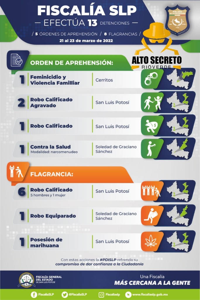 Sobre los mandamientos judiciales, uno corresponde a un hombre de 28 años de edad por delitos contra la salud en su modalidad de narcomenudeo por posesión simple, en Soledad de Graciano Sánchez.