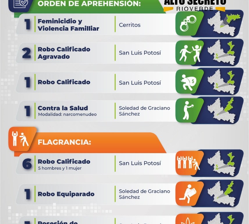 Asimismo, se dio la aprehensión de un individuo de 35 años de edad, por robo equiparado, en la colonia Praderas del Maurel en Soledad de Graciano Sánchez; y a uno más, de 22 años, se le detuvo por posesión de marihuana.