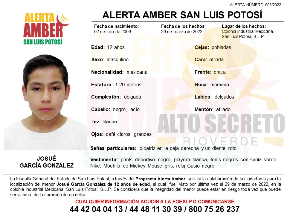 👆A la una de la madrugada, de este día miércoles 30 de Marzo, la FGE, mediante el sistema de búsqueda Alerta Amber, difundió la ficha del niño Josué García González.