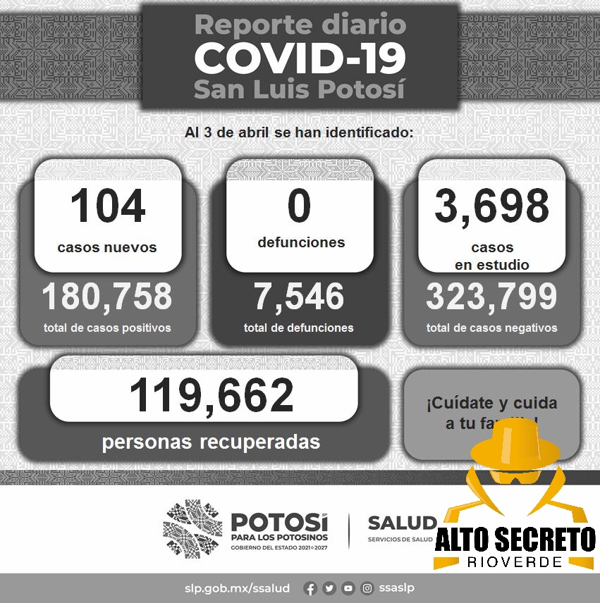 En lo que respecta al informe diario sobre Covid-19, el Comité Estatal para la Seguridad en Salud y los Servicios de Salud informan que, este 3 de abril se confirmaron 104 nuevos contagios en la Entidad, sumando 180 mil 758 casos totales de este padecimiento.