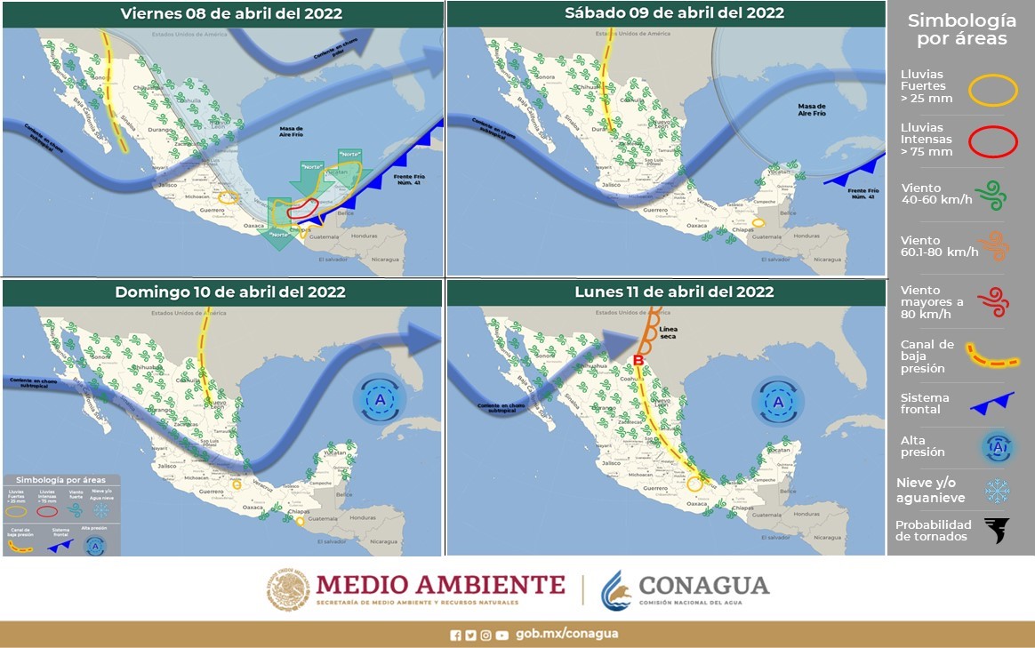 Durante el sábado, la masa de aire frío asociada al frente Núm. 41 modificará sus características térmicas, permitiendo un gradual ascenso de las temperaturas vespertinas sobre el norte, centro y oriente de la República Mexicana, sin embargo, prevalecerá el viento de componente norte con rachas de 70 a 90 km/h en el Istmo y Golfo de Tehuantepec; con rachas de 50 a 60 km/h en las costas de Campeche, Yucatán y Quintana Roo.