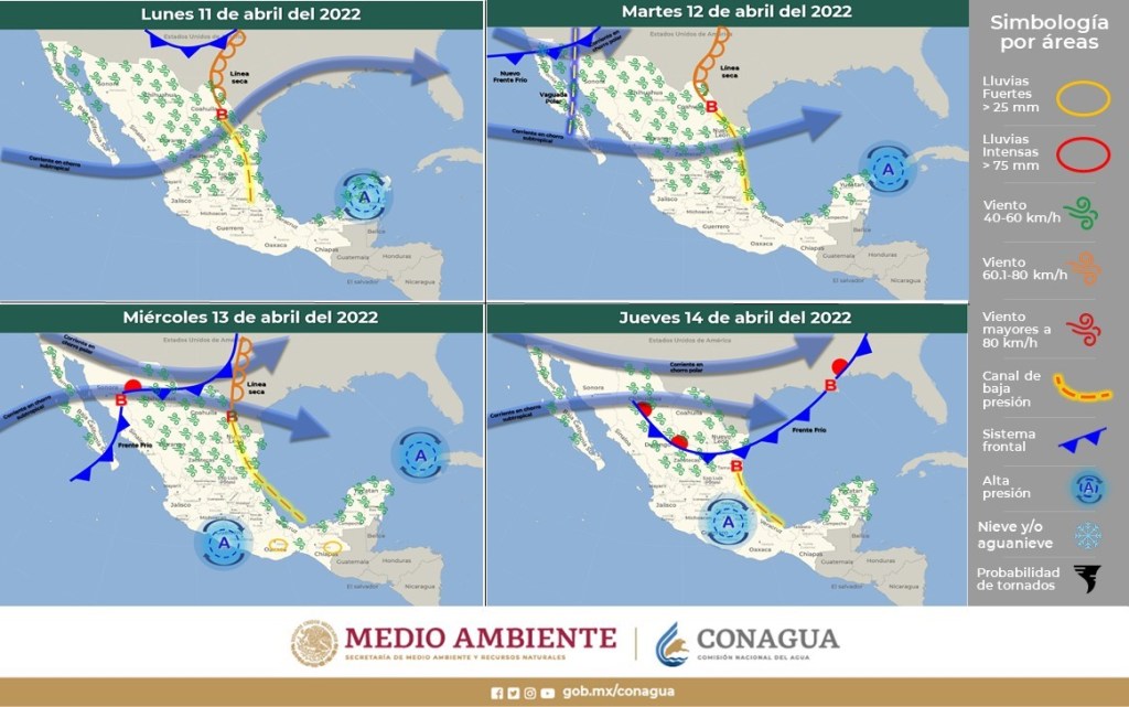 Durante el miércoles y jueves, el frente se desplazará por el norte y noreste del territorio nacional, continuará asociado con la corriente de chorro polar y subtropical, ocasionando rachas fuertes de viento, lluvias y chubascos en las mencionadas regiones.