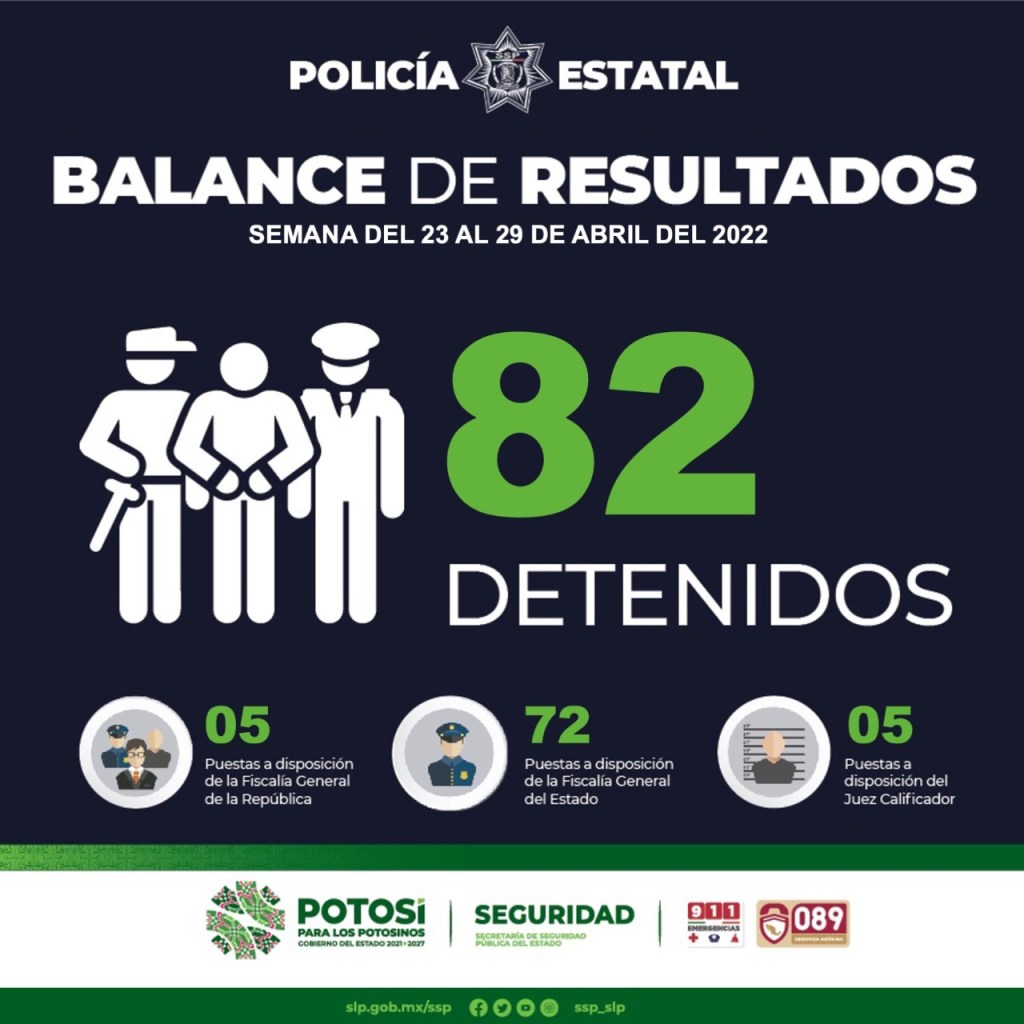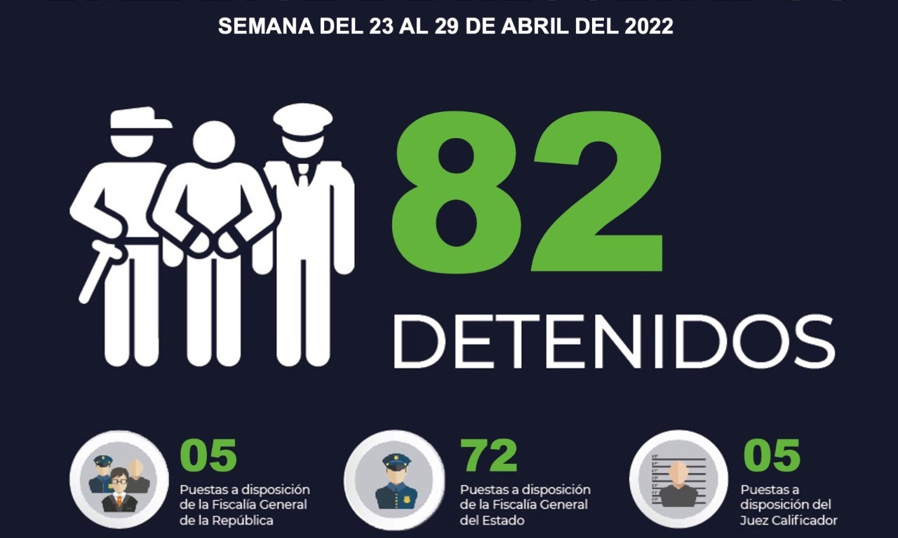 Durante las acciones operativas comprendidas del 23 al 29 de Abril del año en curso, Policías Estatales llevaron a cabo la detención de un total de 82 personas, 5 de ellas fueron puestas a disposición de la Fiscalía General de la República, 72 de ellas quedaron ante la Fiscalía General del Estado y 5 más fueron presentadas ante el Juez Cívico Calificador por faltas administrativas.