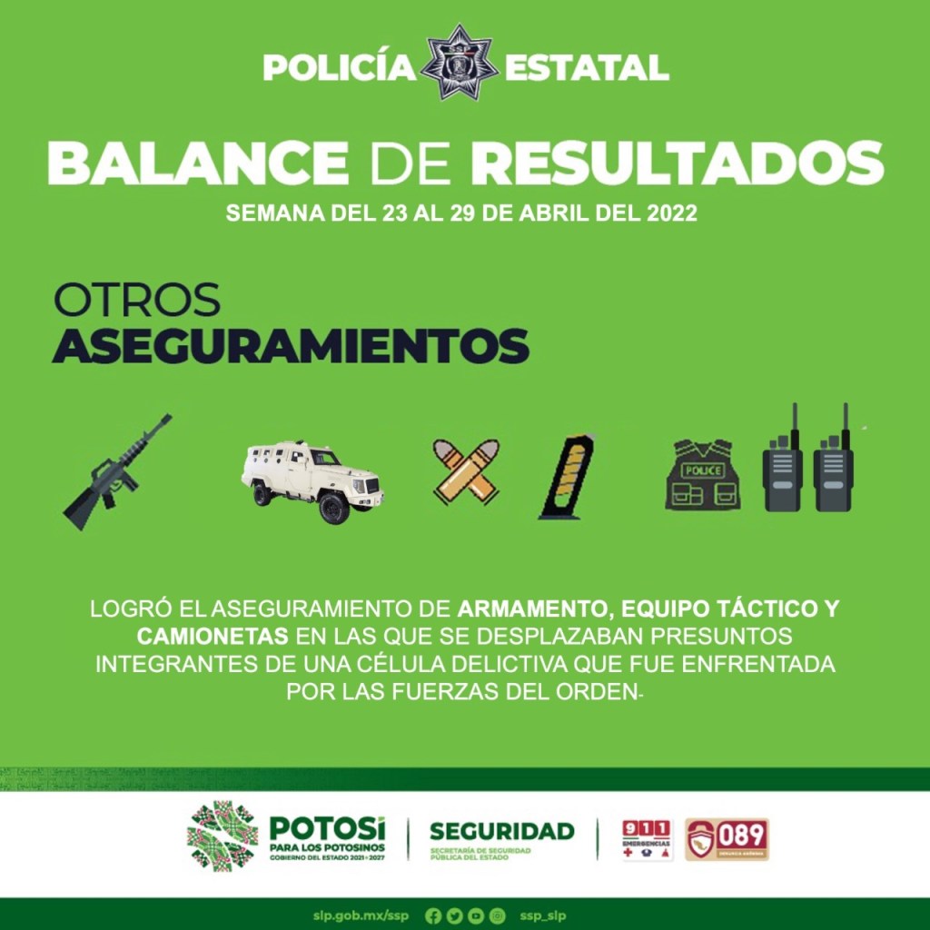 La SSPE continúa trabajando para preservar la paz en la Entidad potosina, por ello también se exhorta a la ciudadanía a coadyuvar con las autoridades Estatales y hacer el reporte correspondiente en caso de ser testigos o víctimas de algún acto delictivo. La Línea de Emergencia 9-1-1 y el 089 Denuncia Anónima están disponibles las 24 horas los 365 días del año.