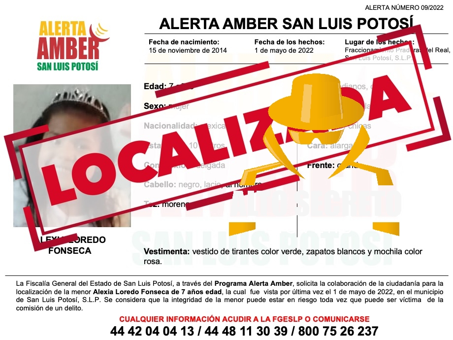 LOCALIZA FGE A NIÑA QUE CONTABA CON ALERTA AMBER EN SAN LUIS POTOSÍ
