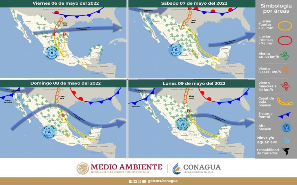 Por otra parte, un segundo canal de baja presión en el sureste de la República Mexicana, generará lluvias puntuales muy fuertes en Chiapas. Las lluvias mencionadas estarán acompañadas de descargas eléctricas, rachas de viento y posible caída de granizo.