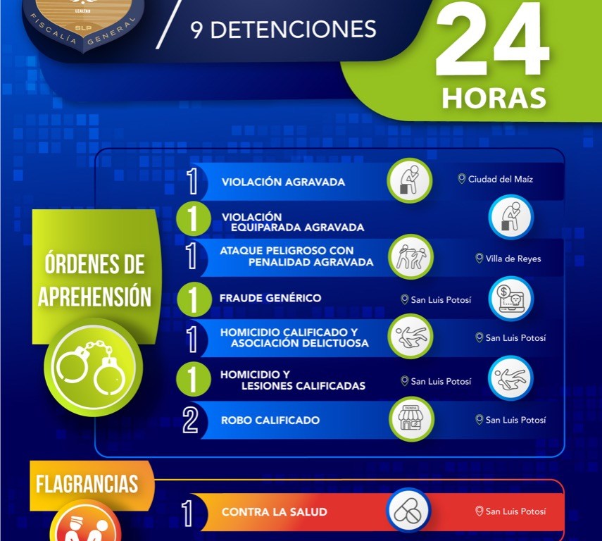 SLP. – La Policía de Investigación (PDI) de la Fiscalía General del Estado (FGE) llevó a cabo la detención de nueve personas que estarían relacionados en la comisión de ilícitos graves en San Luis Potosí.