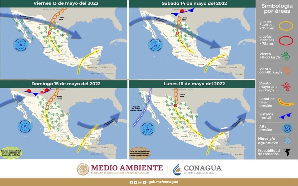 Durante el periodo del pronóstico, una línea seca en el norte de México, divergencia en altura, un canal de baja presión sobre la Mesa del Norte y la corriente en chorro subtropical, propiciarán rachas fuertes de viento con tolvaneras en el noroeste, norte y noreste del país, además de lluvias y chubascos acompañados de descargas eléctricas y posibles granizadas (de diferentes tamaños) sobre entidades de la Mesa del Norte, con lluvias puntuales fuertes en Coahuila y Durango.