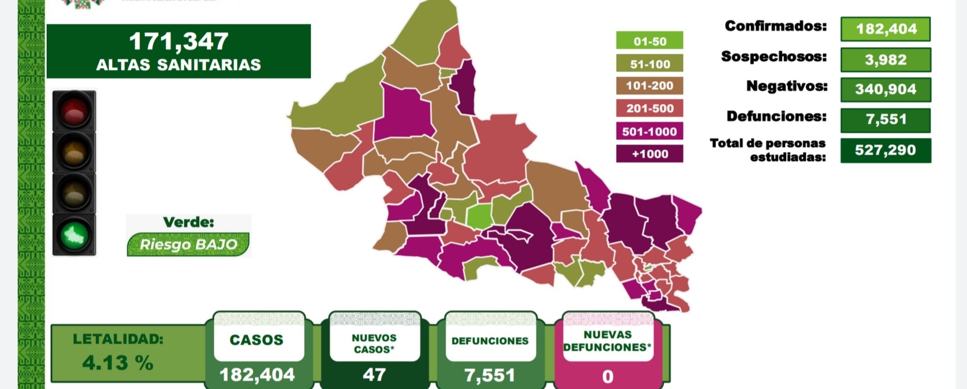 El Comité Estatal para la Seguridad en Salud y los Servicios de Salud, en el Informe Diario de casos Covid-19, dan a conocer 44 nuevos contagios del virus confirmados en la Entidad, con los que suman 182 mil 357 casos totales de este padecimiento.
