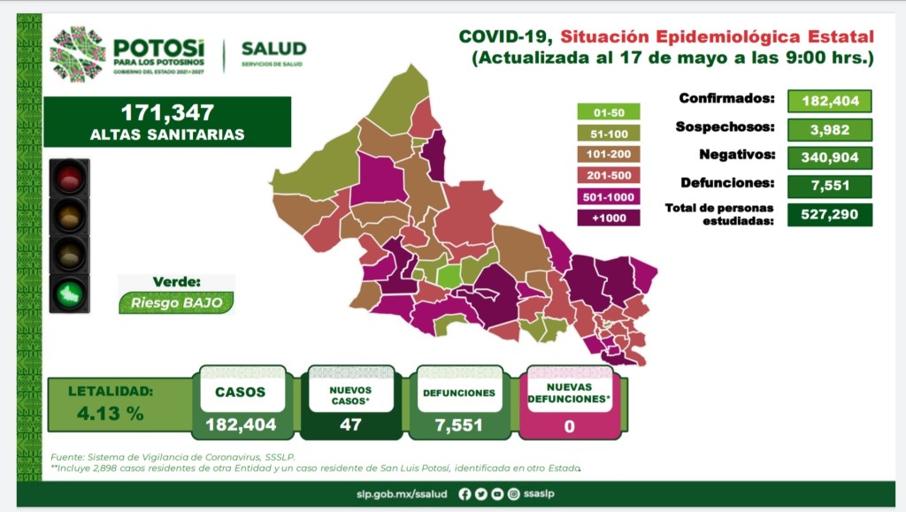 Continúa un total de 7 mil 551 muertes en San Luis Potosí por Covid-19 al no presentarse nuevos decesos; en cuanto a los estudios de nuevos casos, 23 son mujeres y 21 hombres en un rango de edad de 12 a 77 años. Para este 17 de mayo se encuentran hospitalizadas seis personas, dos requieren de respiración asistida.