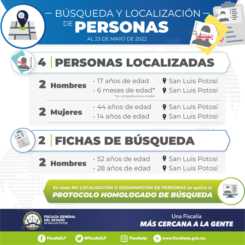 Cuatro personas por las que se había iniciado una ficha de búsqueda en San Luis Potosí, ya fueron localizadas sanas y salvas, informó la Fiscalía General del Estado (FGE).