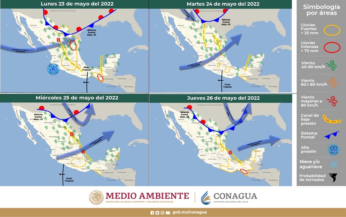Por otro lado, el sistema frontal Núm. 47 se mantendrá con características de estacionario al norte de México en interacción con divergencia en altura y con un canal de baja presión sobre el noreste de México propiciarán lluvias fuertes a muy fuertes con descargas eléctricas y posible caída de granizo en el norte, noreste, oriente, sur y sureste de la República Mexicana.