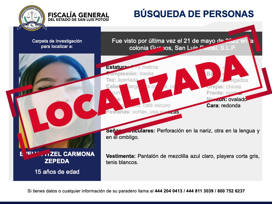 Además, una adolescente de 15 años, quien había sido vista por última vez en la colonia Guanos de la ciudad de San Luis Potosí, desde el pasado 21 de mayo, ya se encuentra con su familia.