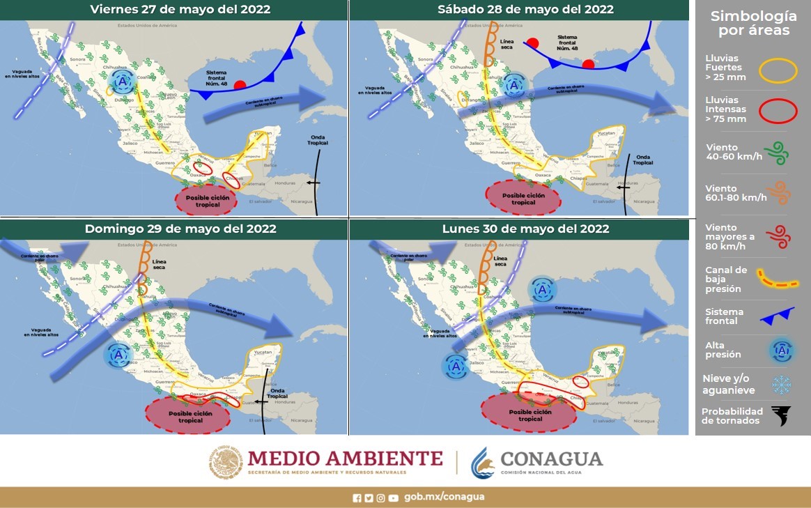 A lo largo de este día, es posible que la zona de baja presión con alto potencial ciclónico de origen al primer ciclón tropical de la temporada 2022 en el Pacífico Nororiental, al sur de las costas de Oaxaca; el cual generará lluvias puntuales intensas en Oaxaca y Chiapas, además de lluvias fuertes a muy fuertes que podrían generar deslaves e inundaciones en el sur y sureste mexicano, además de la Península de Yucatán. También, se pronostican vientos fuertes con rachas de 60 a 70 km/h y oleaje de 1 a 3 metros de altura en las costas de Oaxaca.