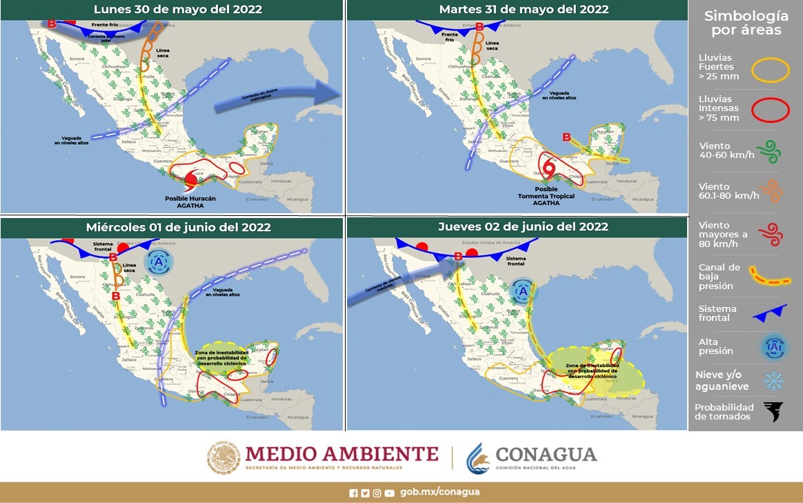 Durante el período de pronóstico, un canal de baja presión sobre la Mesa del Norte, una línea seca en el norte del país, divergencia en altura, un frente frío muy próximo al noroeste de México y el ingreso de humedad del Océano Pacífico favorecido por la circulación de Agatha, generarán chubascos y lluvias puntuales fuertes acompañadas de descargas eléctricas en norte, noreste, centro y occidente de la República Mexicana.