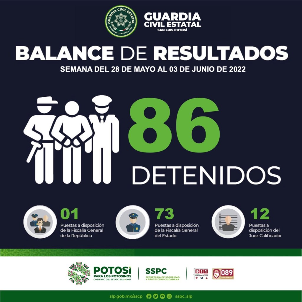 SECRETARÍA DE SEGURIDAD Y PROTECCIÓN CIUDADANA DEL ESTADO INFORMA EL BALANCE DE RESULTADOS DEL 28 DE MAYO AL 03 DE JUNIO