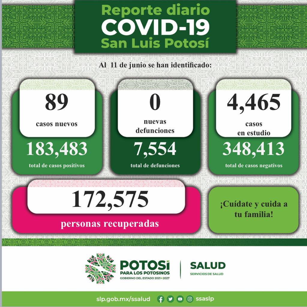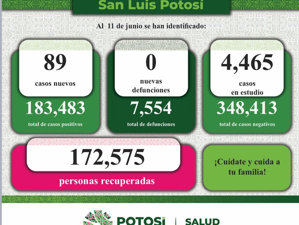 Se dan a conocer en el Informe Diario de casos Covid-19, 89 nuevos contagios en la Entidad, teniendo un acumulado de 183 mil 483 casos totales de este padecimiento. De estos nuevos contagios, 76 se detectaron en la Jurisdicción Sanitaria I; cinco en la Jurisdicción Sanitaria V de Ciudad Valles; uno en la Jurisdicción Sanitaria VI de Tamazunchale; en las jurisdicciones sanitarias II de Matehuala, III de Villa de Pozos, IV de Rioverde y VII de Tancanhuitz no se registraron nuevos casos.