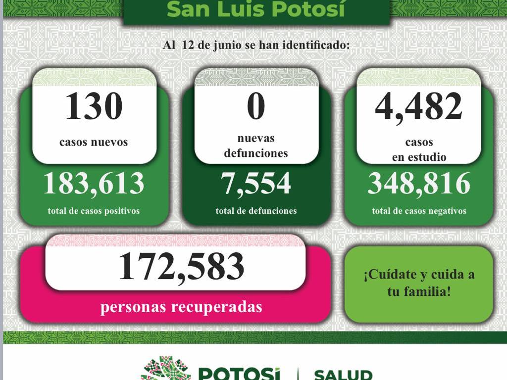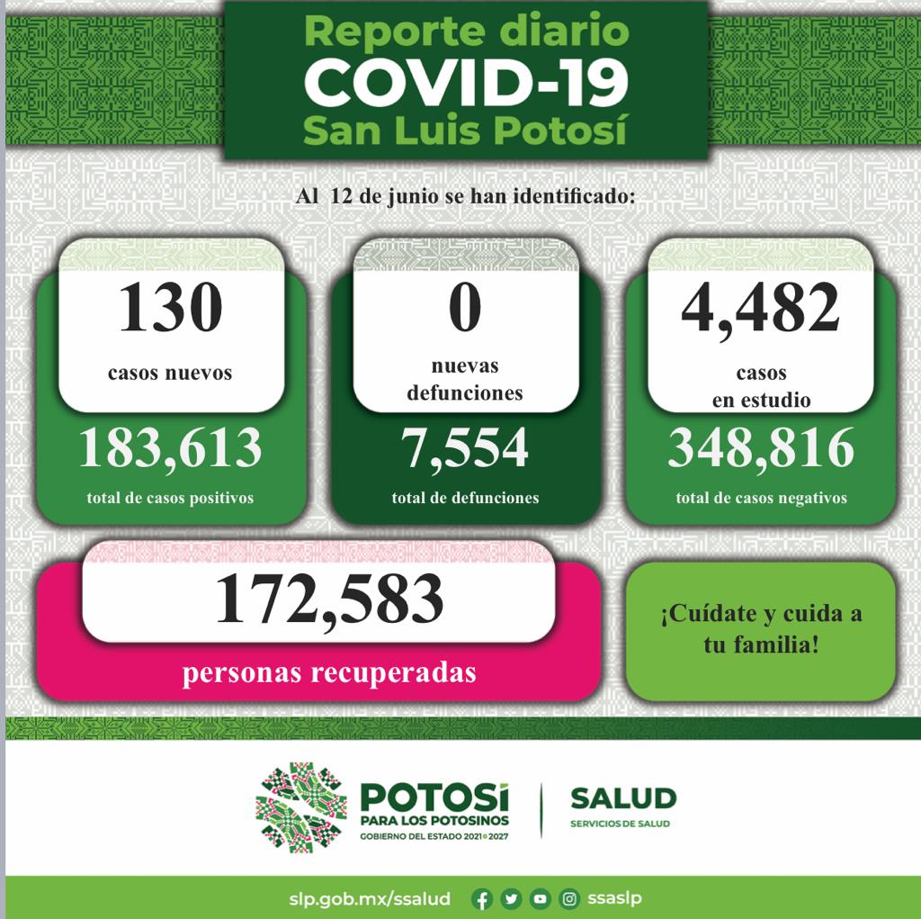 En cuanto al Informe Diario de casos Covid-19, se dan a conocer 130 nuevos contagios confirmados en la Entidad. De esta forma, el Comité Estatal para la Seguridad en Salud y los Servicios de Salud informan que, hasta este 12 de junio, se registran 183 mil 613 casos totales de este padecimiento.