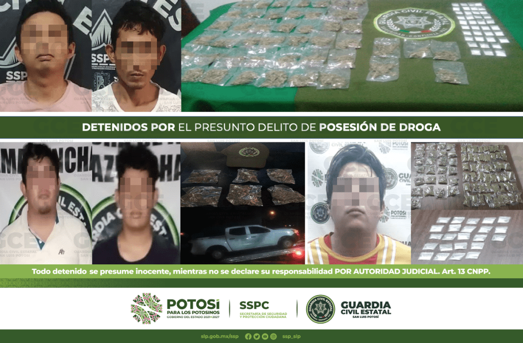 En el Municipio de Tamazunchale, cinco personas resultaron detenidas, dos de ellas en el eje estatal tramo San Martín, en el entronque a la Providencia, en dicho lugar los agentes de la GCE tuvieron contacto con Misael y Richie ambos de 22 años de edad y con Juan de 23 años de edad, a quienes les aseguraron aproximadamente 302 gramos de marihuana, distribuida en 47 dosis, 38 dosis de una sustancia blanca y granulada con las propiedades físicas de la droga “cristal”; el automóvil marca Ford, tipo Fiesta, modelo 2017, color rojo, en el que se desplazaban también fue asegurado.
