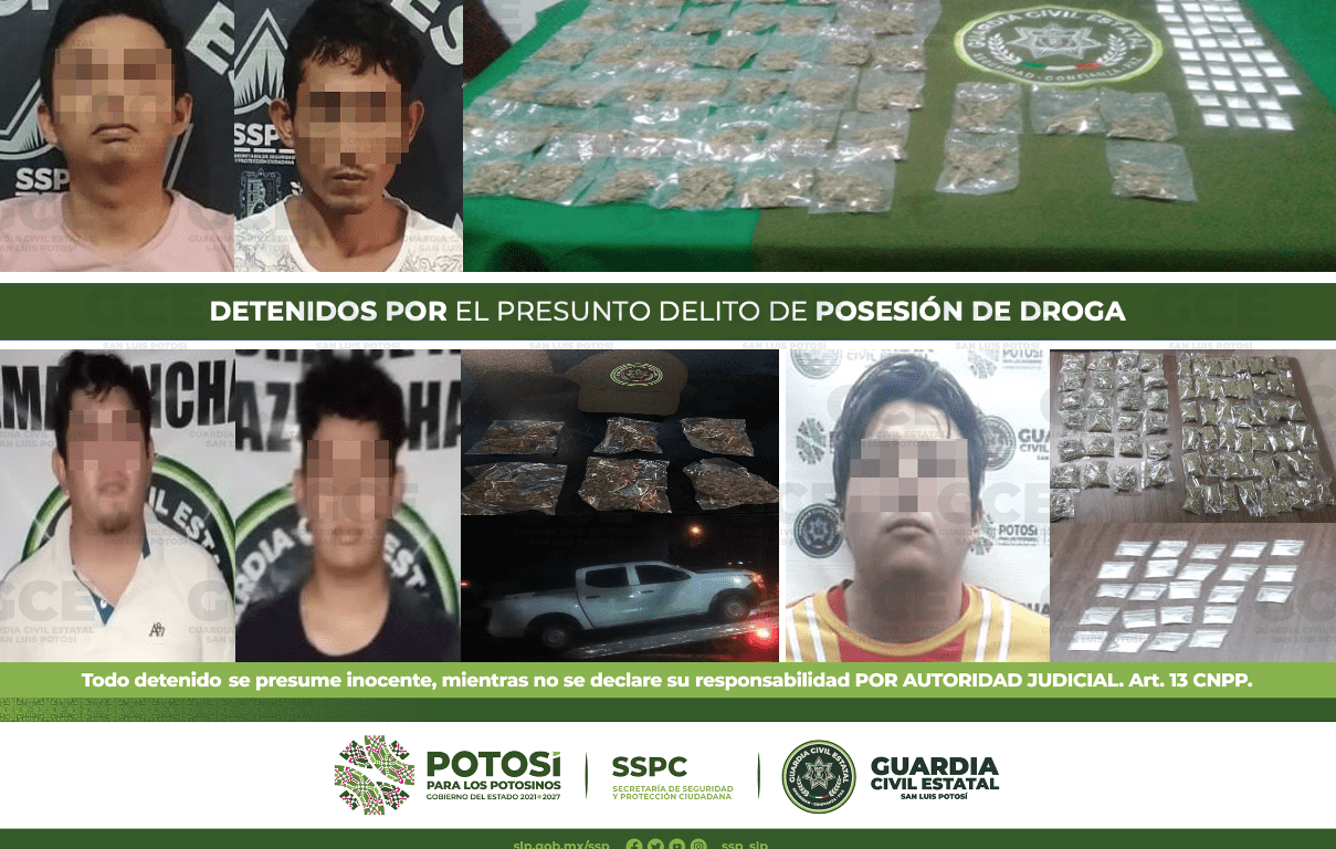 En el Municipio de Tamazunchale, cinco personas resultaron detenidas, dos de ellas en el eje estatal tramo San Martín, en el entronque a la Providencia, en dicho lugar los agentes de la GCE tuvieron contacto con Misael y Richie ambos de 22 años de edad y con Juan de 23 años de edad, a quienes les aseguraron aproximadamente 302 gramos de marihuana, distribuida en 47 dosis, 38 dosis de una sustancia blanca y granulada con las propiedades físicas de la droga “cristal”; el automóvil marca Ford, tipo Fiesta, modelo 2017, color rojo, en el que se desplazaban también fue asegurado.