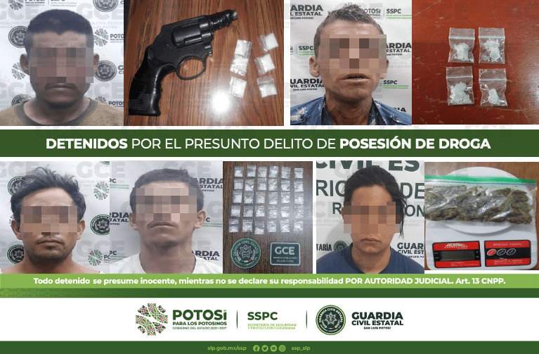 Derivado de los diferentes operativos desplegados en la Capital potosina y al interior del Estado por elementos de la Guardia Civil Estatal (GCE), cinco personas resultaron detenidas por el presunto delito de posesión de droga.