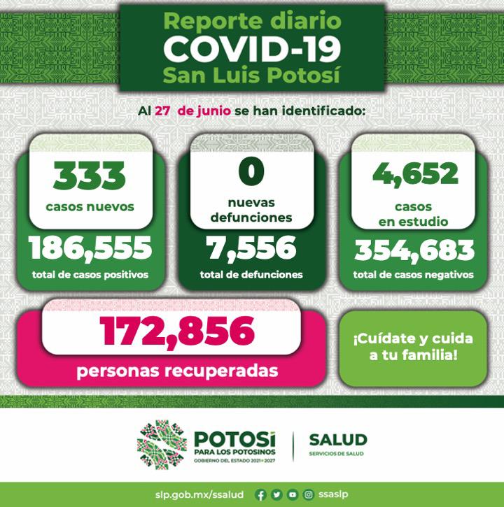 En el Informe Diario de casos Covid-19, se dan a conocer 333 nuevos contagios confirmados en la Entidad. De esta forma, el Comité Estatal para la Seguridad en Salud y los Servicios de Salud informan que, hasta este 27 de junio, se registran 186 mil 555 casos totales de este padecimiento.