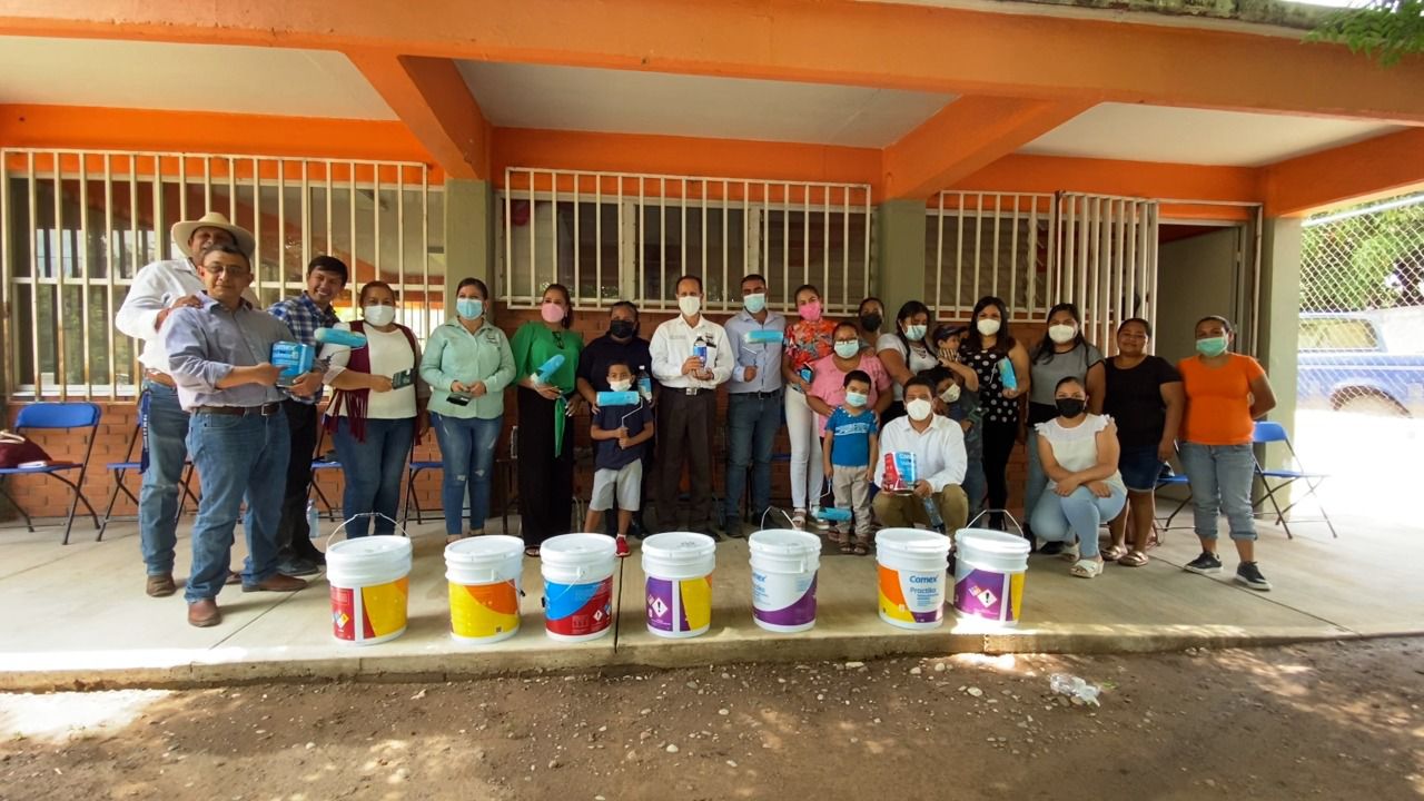 Cumpliendo con una de las peticiones que padres de familia y personal docente de del Centro de Atención Psicológica de Educación Preescolar de la Zona Media, ubicado en el ejido El Refugio, se llevó a cabo la entrega de cubetas de pinturas brochas, rodillos y otros materiales para la rehabilitación del plantel educativo.