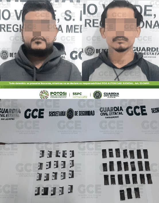 En recorridos de prevención y seguridad sobre calle Salazar y 16 de Septiembre en el Barrio San Francisco, se concreta la detención de Juan C. de 29 años de edad y Mario A. de 39 años de edad, por la posesión de un total de 44 dosis al parecer de la droga sintética conocida como “cristal” con un peso de 32 gramos, la envoltura cuenta con el emblema “V.E.”