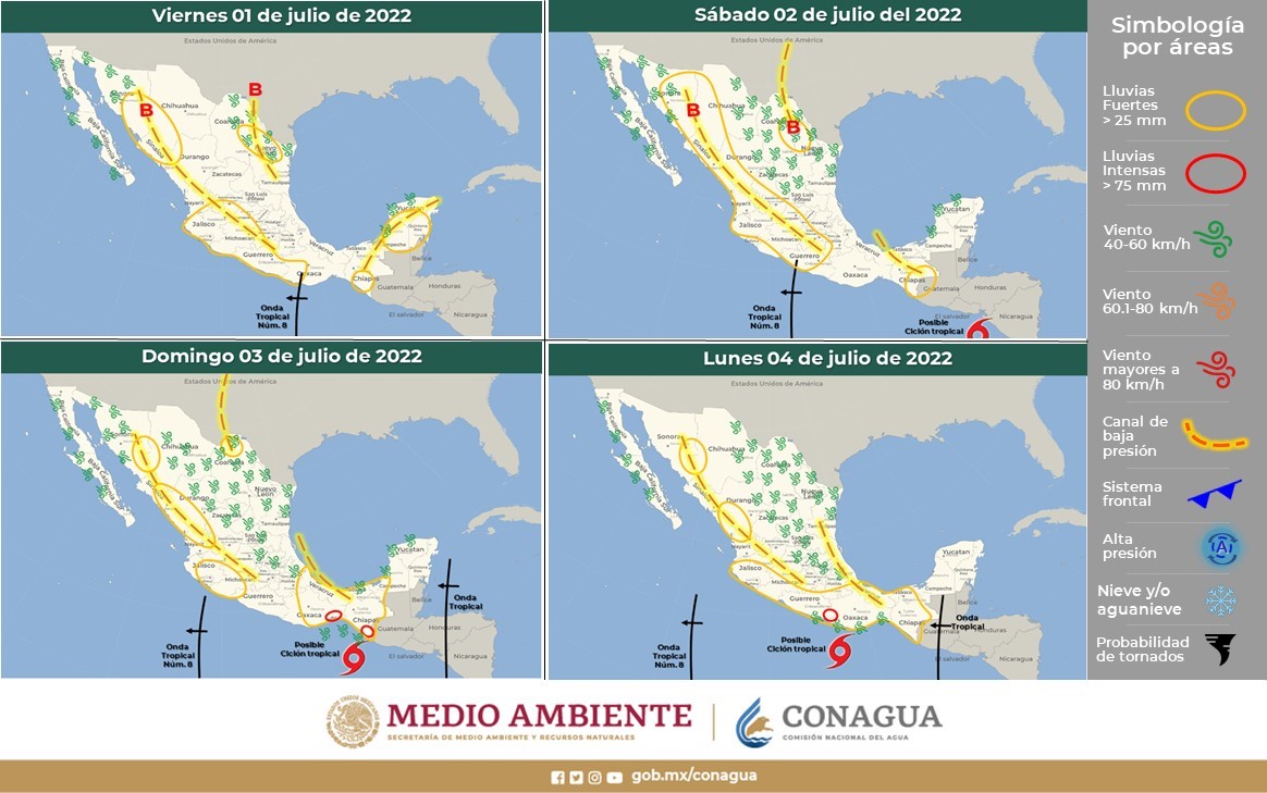 Un canal de baja presión sobre el occidente y centro del país, en combinación con la onda tropical Núm. 8 que recorrerá el sur del país, ocasionarán lluvias fuertes con tormentas eléctricas en dichas regiones, previéndose lluvias puntuales muy fuertes en Guerrero. Otro canal de baja presión en la Península de Yucatán y la entrada de humedad del Mar Caribe ocasionarán, en horas de la tarde, lluvias fuertes en Campeche, Yucatán y Quintana Roo.