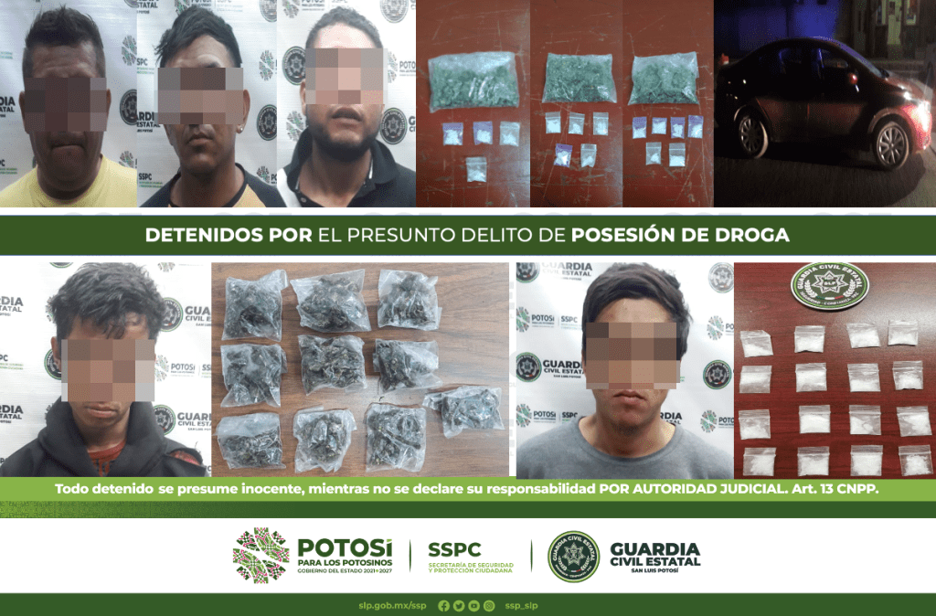 En el municipio de Soledad de Graciano Sánchez, durante los patrullajes sobre Paseo de las Magnolias y las vías México-Laredo, fueron detenidos Daniel de 45 años de edad, Jonathan de 22 años de edad y Christian de 28 años de edad, quienes fueron sorprendidos con 15 dosis de “cristal” y tres bolsas con aproximadamente 190 gramos de marihuana. El automotor Nissan, tipo Sentra, en el que se trasladaban, también fue asegurado.
