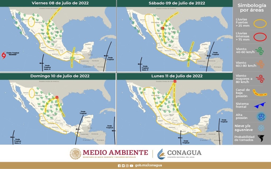 Durante el período de pronóstico, el monzón mexicano en el noroeste del país, un canal de baja presión extendido sobre la Mesa del Norte, divergencia en altura y el ingreso de humedad del Océano Pacífico, originarán chubascos y lluvias fuertes a puntuales muy fuertes con descargas eléctricas y posible caída de granizo sobre entidades del noroeste y occidente del territorio nacional.