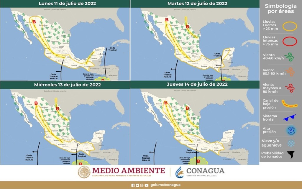 La onda tropical Núm. 10 se desplazará al sur de las costas de Jalisco e interaccionará con un canal de baja presión que se extenderá desde el occidente hasta el centro del país, generando lluvias fuertes a muy fuertes acompañadas de descargas eléctricas y posibles granizadas en las regiones mencionadas, incluido el Valle de México.