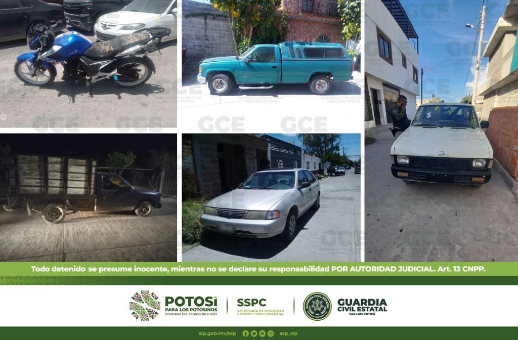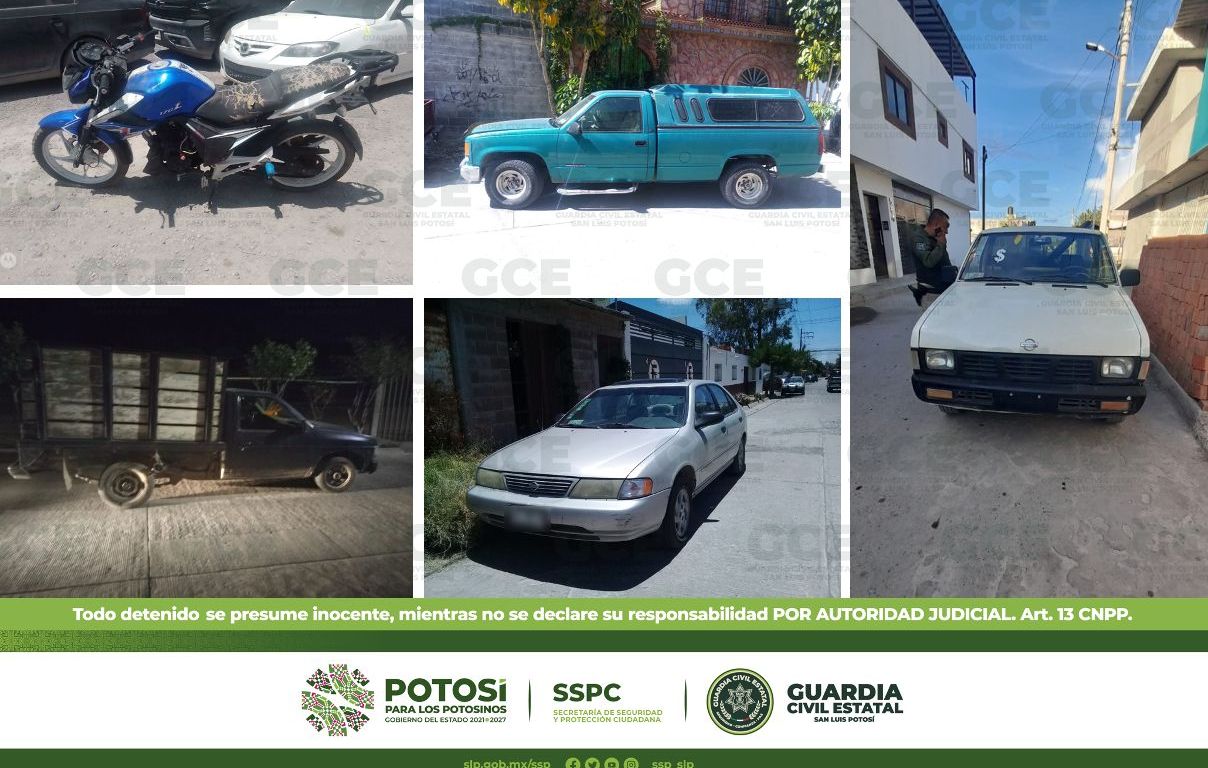 En el Municipio de Soledad de Graciano Sánchez dos unidades fueron localizadas por oficiales de la GCE, una de ellas en la calle de Guirnalda en el Fraccionamiento Villa Jardín, se trata de un automotor marca Nissan, tipo Sentra, modelo 1995, color gris, con placas de esta entidad, el cual contaba con reporte de robo del 09 de julio de 2022 de la Avenida Ricardo B. Anaya.