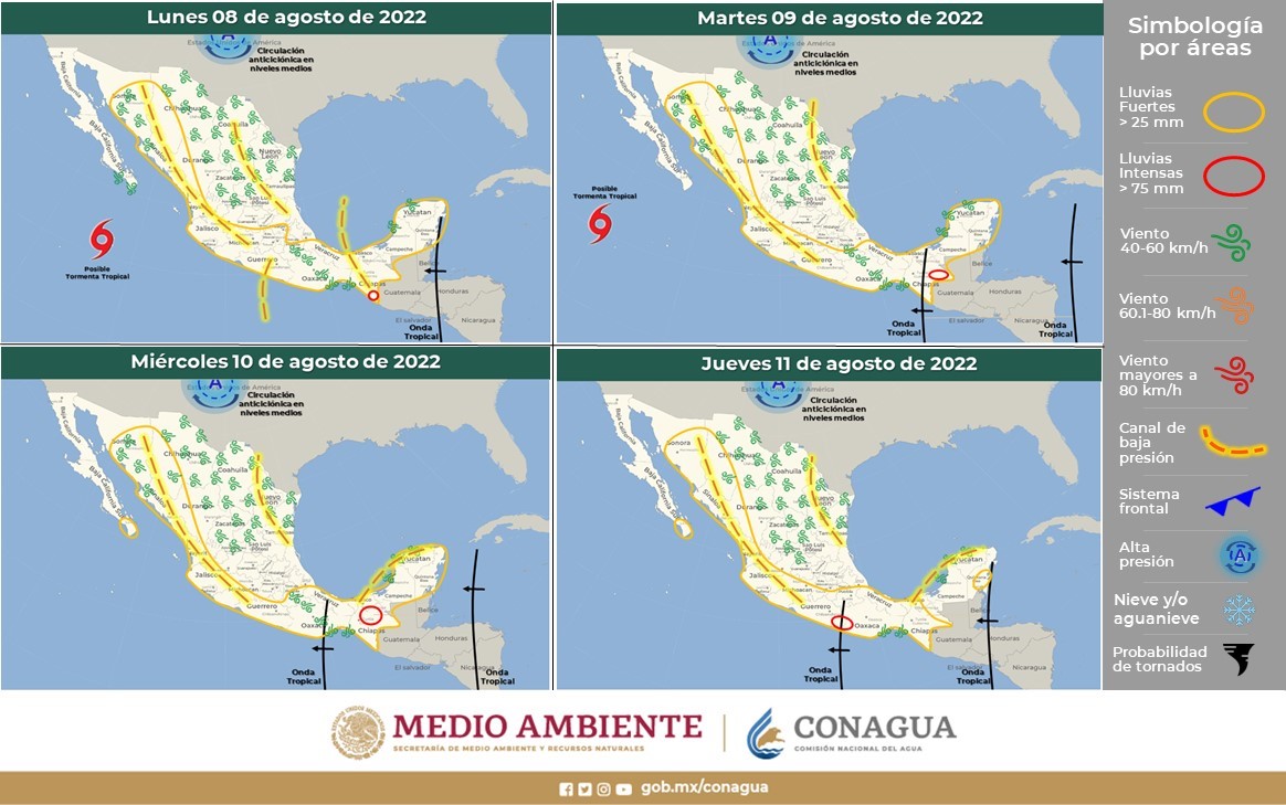 Durante el periodo del pronóstico, el monzón mexicano sobre el noroeste de México continuará generando chubascos en la Península de Baja California, así como lluvias fuertes a muy fuertes con posibles granizadas en zonas de Sonora, Chihuahua, Durango y Sinaloa.