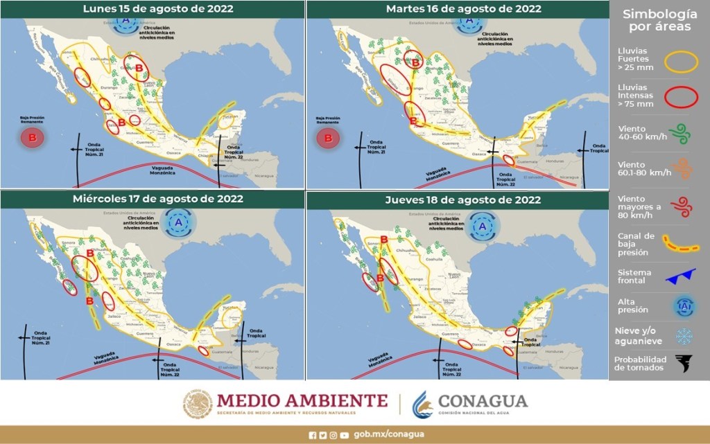 Onda tropical Núm. 22 se desplazará a lo largo de las costas del Pacífico Sur y Central Mexicano, incrementado la probabilidad de lluvias fuertes sobre las regiones mencionadas. Mientras que una nueva onda tropical ingresará al sureste mexicano y la Península de Yucatán, generando los mismos efectos.