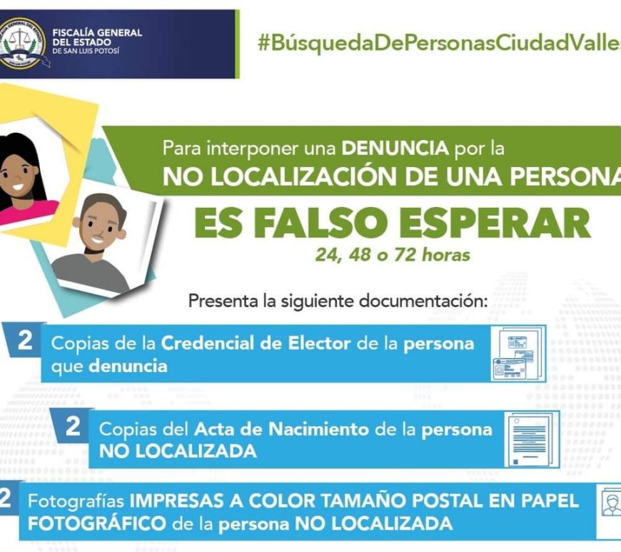 Para interponer una denuncia por la No Localización de una persona es importante saber que documentación debes presentar y a que instancias debes acudir a presentar tu denuncia, recuerda que es falso que debas esperar 24 horas para reportarla. Debes de acudir a la Delegación dr la Fiscalía General del Estado, más cercana, presentando la documentación que se ilustra en la imagen. Continúa leyendo CÓMO PRESENTAR DENUNCIA POR DESAPARICIÓN O NO LOCALIZACIÓN DE PERSONA?