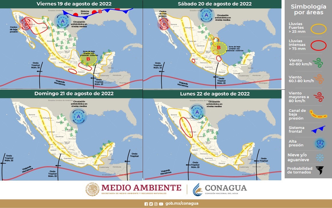 Durante el período de pronóstico, el monzón mexicano, la onda tropical Núm. 23 se desplazará sobre el sureste, sur, centro y occidente de México, canales de baja presión prevalecerán en el occidente, centro y sureste del país, aunado a divergencia en altura y entrada de humedad de ambos litorales, ocasionarán lluvias fuertes a muy fuertes con posibles granizadas sobre entidades del noroeste, occidente, centro y sur de la República Mexicana, incluidos el Valle de México y Península de Baja California, con lluvias puntuales intensas en zonas de Sonora, Chihuahua, Durango, Sinaloa, Nayarit, Jalisco, Colima, Michoacán y Guerrero que podrían originar incremento en los niveles de ríos y arroyos, deslaves e inundaciones.