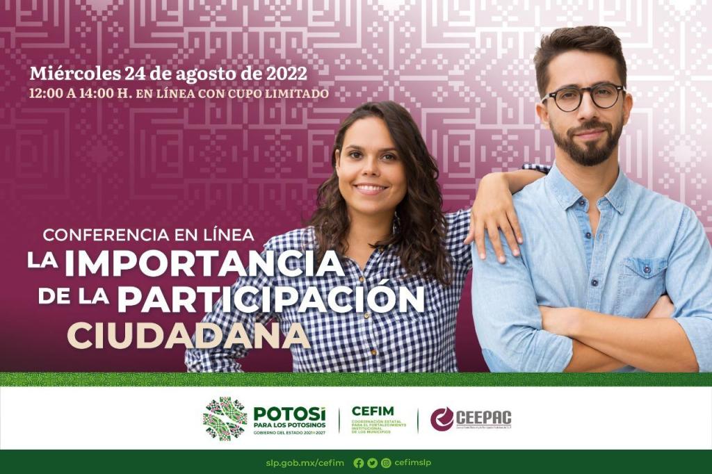 Ante la necesidad de fortalecer la integración de la ciudadanía en el ejercicio gubernamental y resultado de un trabajo coordinado, como lo definió el Gobernador de San Luis Potosí, Ricardo Gallardo Cardona, la Coordinación Estatal para Fortalecimiento Institucional de los Municipios (Cefim) y el Consejo Estatal Electoral y de Participación Ciudadana (Ceepac), con el Sistema de Profesionalización para el Fortalecimiento Municipal, ofrecerán en línea una conferencia sobre participación ciudadana dirigida a los 58 municipios.