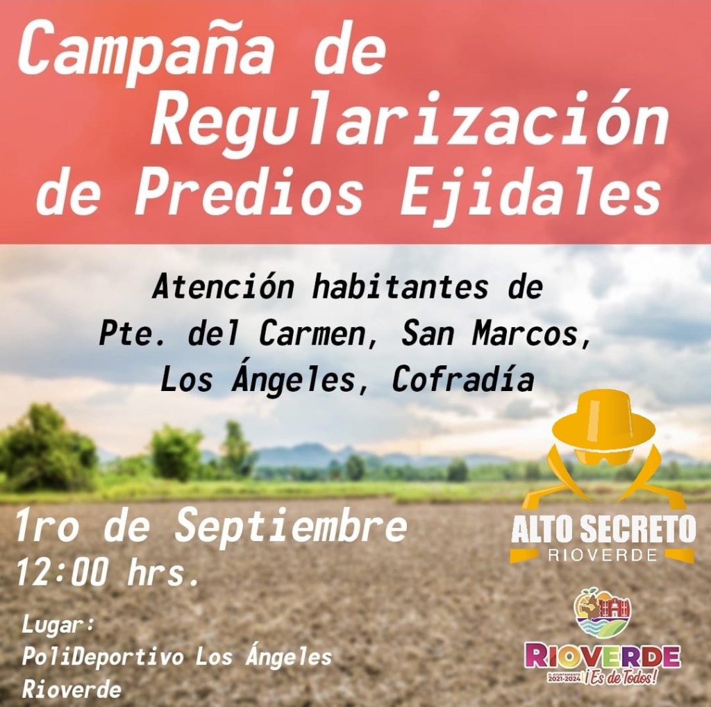 Próximo 1 de Septiembre en polideportivo Los Ángeles en Rioverde, reunión para regularización de predios!!!…