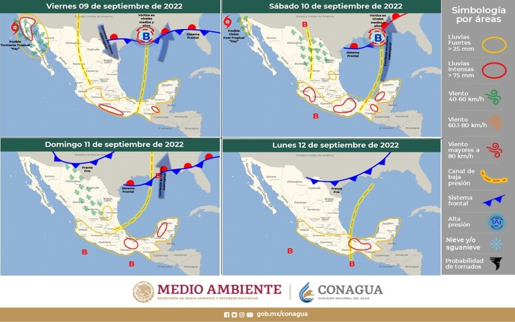 Para hoy, la tormenta tropical Kay se desplazará frente a la costa occidental de Baja California y sus extensas bandas nubosas generarán lluvias puntuales torrenciales en Baja California, puntuales intensas en Sonora, así como lluvias puntuales fuertes en Baja California Sur. Asimismo, se prevén rachas de viento muy fuertes a intensas y oleaje elevado en la Península de Baja California, el norte del Golfo de California y la costa norte de Sonora. Por otra parte, un vórtice en niveles medios de la atmósfera en el norte del Golfo de México, en combinación con un canal de baja presión que se extenderá hasta el sureste del país, producirán lluvias muy fuertes en Puebla, Veracruz, Tabasco y los estados de la Península de Yucatán y puntuales intensas en Oaxaca y Chiapas.