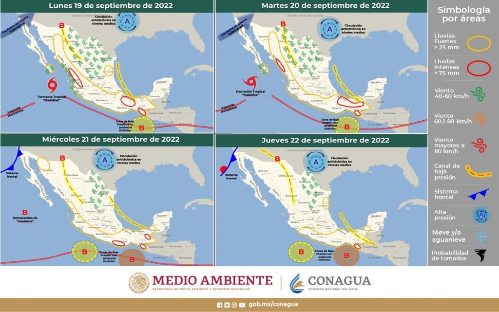 Este día, el centro de la tormenta tropical Madeline se localizará al sur de Baja California Sur. La entrada de humedad generada por su circulación en interacción con un canal de baja presión sobre la Sierra Madre Occidental, ocasionará lluvias puntuales intensas en Sinaloa, Nayarit y Jalisco, muy fuertes en Sonora y Durango, así como lluvias fuertes en Baja California Sur y Chihuahua; asimismo, se pronostican rachas de viento de 60 a 70 km/h y oleaje de 2 a 4 metros de altura en la costa sur de Baja California Sur, y vientos con rachas de 50 a 60 km/h y olas de 1 a 3 metros de altura en el sur del Golfo de california y en costas de Sinaloa, Nayarit y Jalisco.