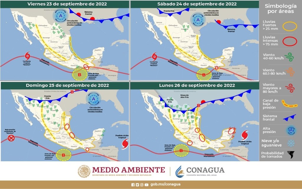 Durante el período de pronóstico, canales de baja presión sobre el noroeste, occidente, centro, noreste, oriente y sureste del territorio nacional; la vaguada monzónica que se extenderá muy próxima a las costas del Pacífico Sur Mexicano; una zona de baja presión con potencial ciclónico que se desplazará paralela a las costas del Pacífico Mexicano; ingreso de humedad proveniente del Océano Pacífico, Golfo de México y Mar Caribe y divergencia en altura, generarán chubascos y lluvias fuertes a muy fuertes en las regiones mencionadas, además de la Península de Yucatán, con lluvias puntuales intensas en zonas de Chiapas, Oaxaca, Veracruz, Puebla, Tamaulipas, San Luis Potosí, Hidalgo y Guerrero.