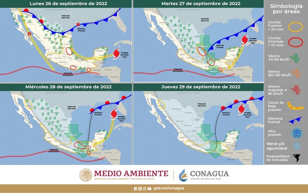 La aproximación del huracán Ian originará el flujo de aire húmedo del Mar Caribe hacia costas de la Península de Yucatán, generando lluvias puntuales muy fuertes en Quintana Roo y Yucatán, así como lluvias puntuales fuertes en Campeche; rachas de viento de 60 a 70 km/h y oleaje de 2 a 3 metros de altura, sobre costas de Quintana Roo y Yucatán.