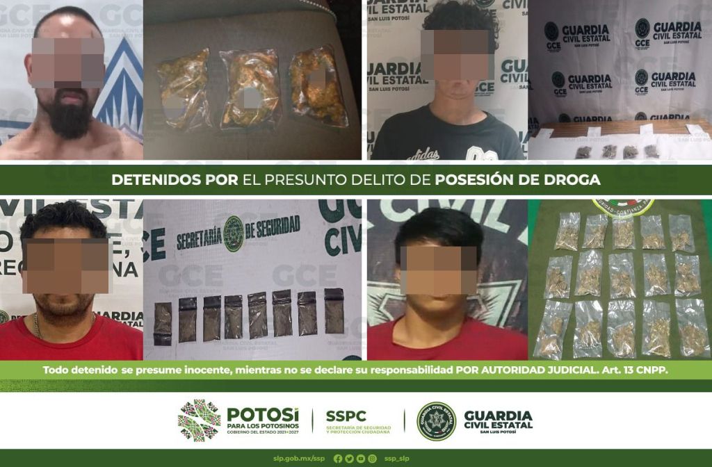 Por último, en el municipio de Matehuala, sobre la calle de Independencia en la colonia San Miguelito; los elementos de la GCE detuvieron a José de 19 años de edad luego de asegurarle cuatro bolsas con una hierba verde y seca con las características físicas de la marihuana.