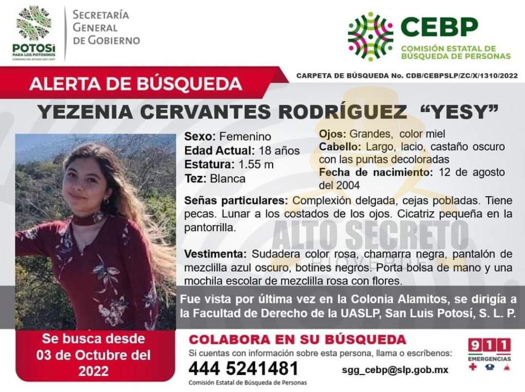 Sobre la no localización de una estudiante de la Facultad de Derecho de la Universidad Autónoma de San Luis Potosí (UASLP), la Fiscalía General del Estado (FGE) informó que continúan las labores para su ubicación.