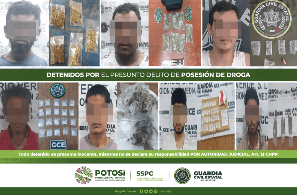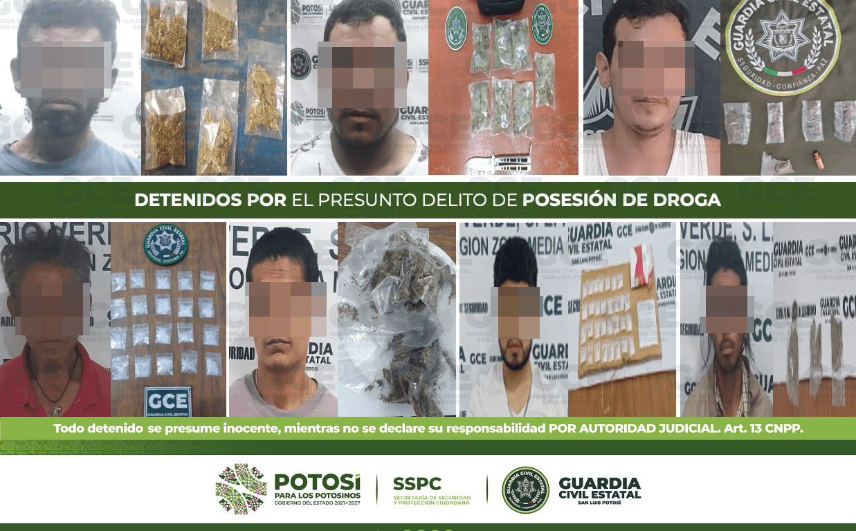 S.L.P.- En el marco de los operativos desplegados en las cuatro regiones del Estado para inhibir actos como la distribución, venta y consumo de drogas, agentes de la Guardia Civil Estatal lograron asegurar 73 dosis de enervantes y detener a 7 personas por el presunto delito de posesión de droga.