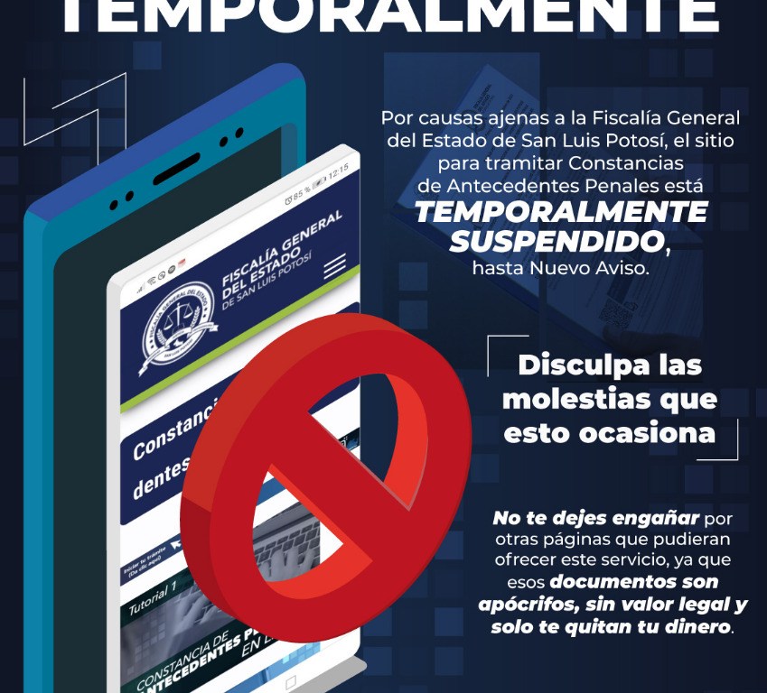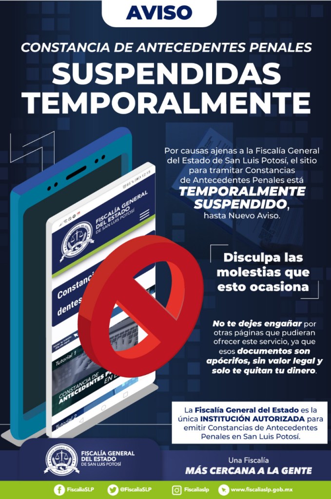 La Fiscalía General del Estado de San Luis Potosí (FGESLP) dio a conocer a la ciudadanía, que el sitio web para tramitar Constancias de Antecedentes Penales está temporalmente suspendido y se restablecerá hasta nuevo aviso.