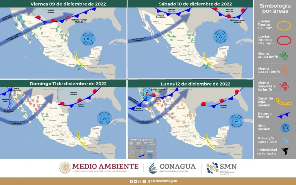 A partir del domingo, un nuevo frente frío ingresará al noroeste de la República Mexicana y asociado a una vaguada polar podría dar origen a una posible tormenta invernal, por lo que se prevé un mayor descenso de las temperaturas, vientos muy fuertes a intensos con tolvaneras, lluvias y chubascos sobre el noroeste y norte del país, con lluvias puntuales fuertes en Baja California y Sonora. A su vez, se pronostica la caída de nieve o aguanieve sobre las sierras de Baja California, Sonora, Chihuahua y Durango.
